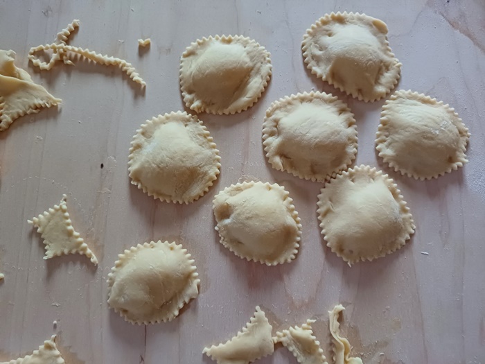 Com um cortador dentado, corte os ravioli doces no formato que preferir.