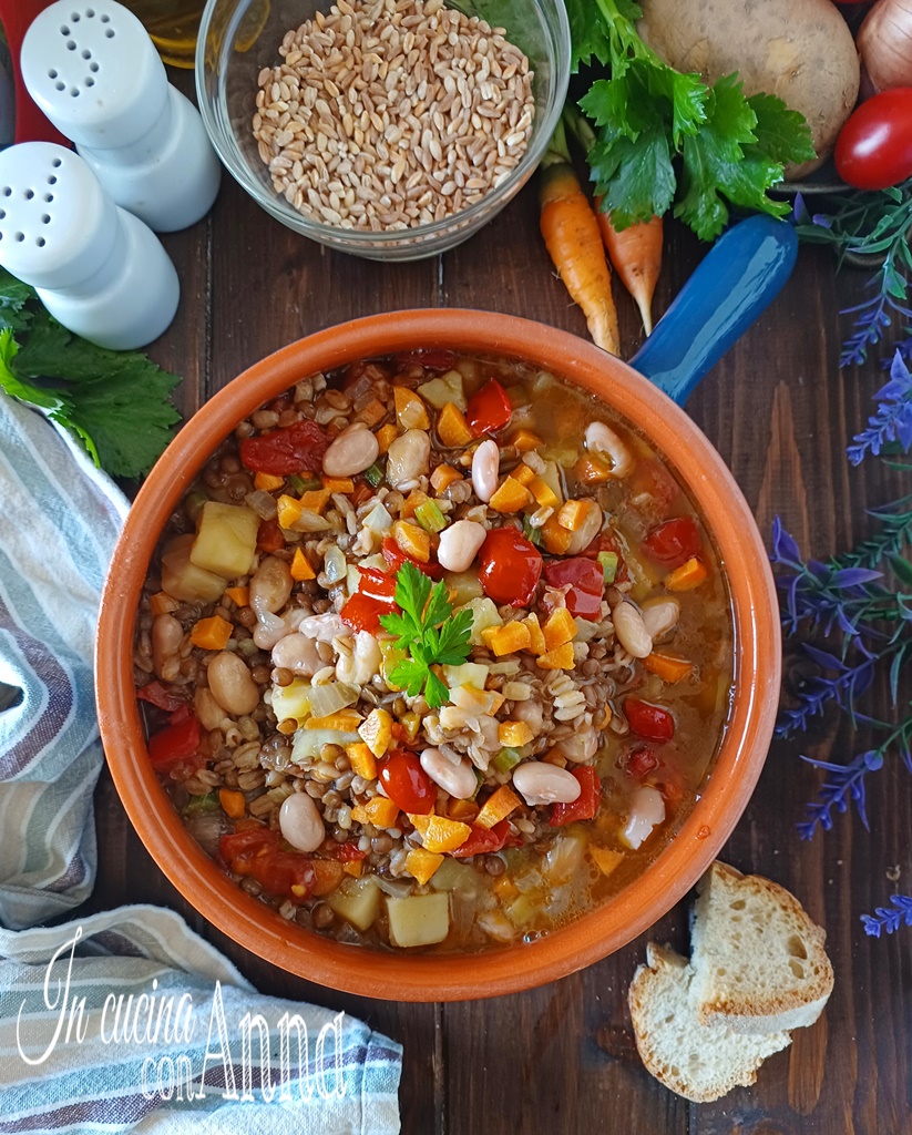 Corte os tomatinhos em cubos e adicione-os na panelinha, cozinhe rapidamente junto com os legumes e depois reserve tudo.Após 40 minutos, adicione as lentilhas, as batatas e os cereais (lavados rapidamente em água corrente) aos feijões.
