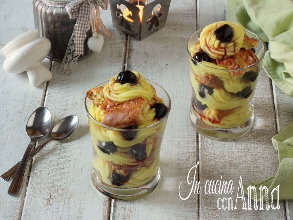Monte os copos começando com uma boa camada de creme de confeiteiro, coloque algumas amarena, um pedaço de zeppola, com um pincel umedeça um pouco a zeppola com a calda, depois mais uma camada de creme, novamente amarena, zeppola e calda, mais uma camada de creme, zeppola e calda, um monte de creme e amarena.