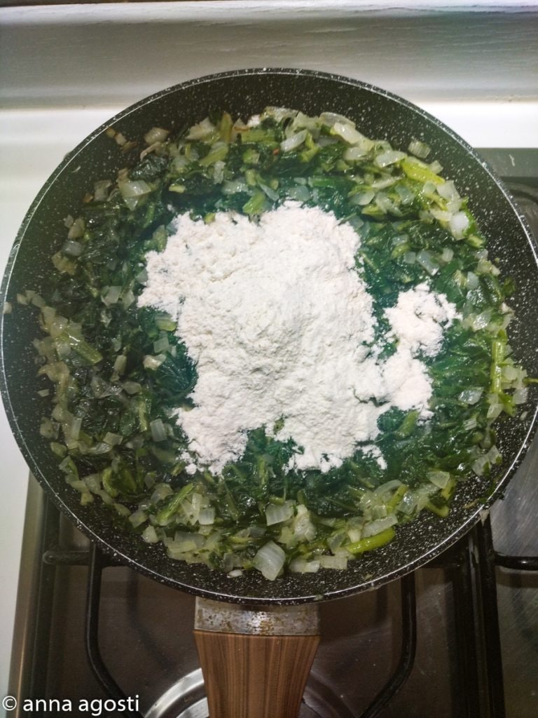 Adicione às cebolas, tempere com sal, pimenta e noz-moscada, e deixe apurar por alguns minutos.7- Depois, adicione a farinha e misture rapidamente ao restante, ainda no fogo.
