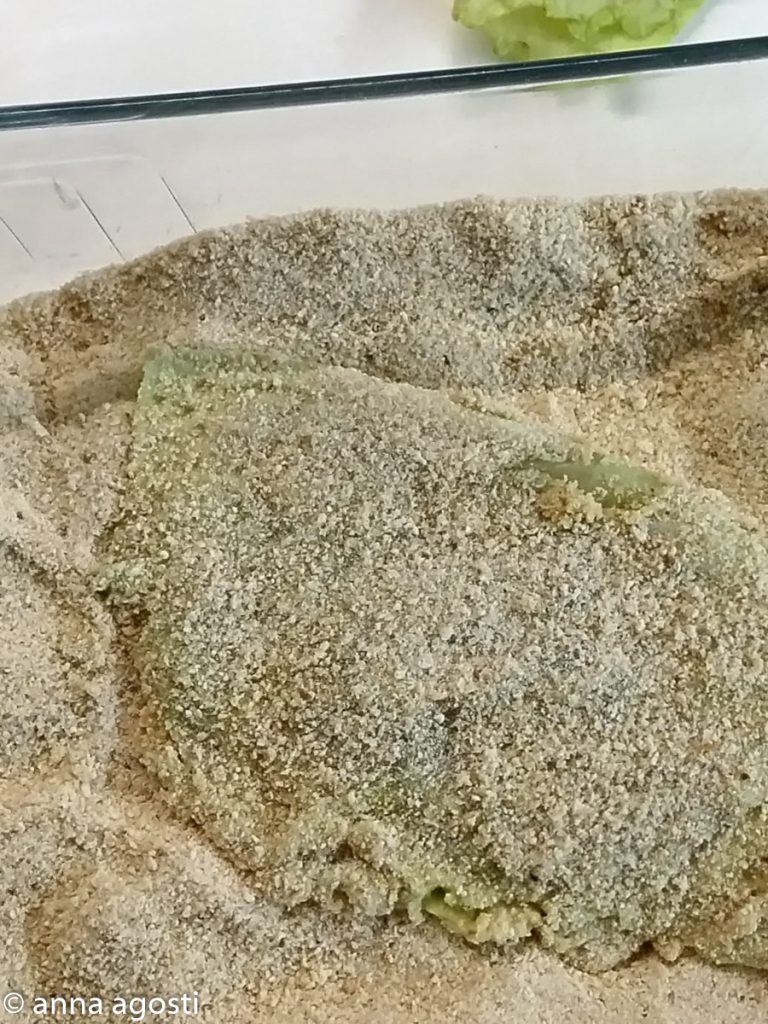 Passe então cada bife de repolho nos ovos batidos e depois na farinha de rosca.