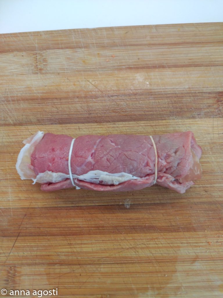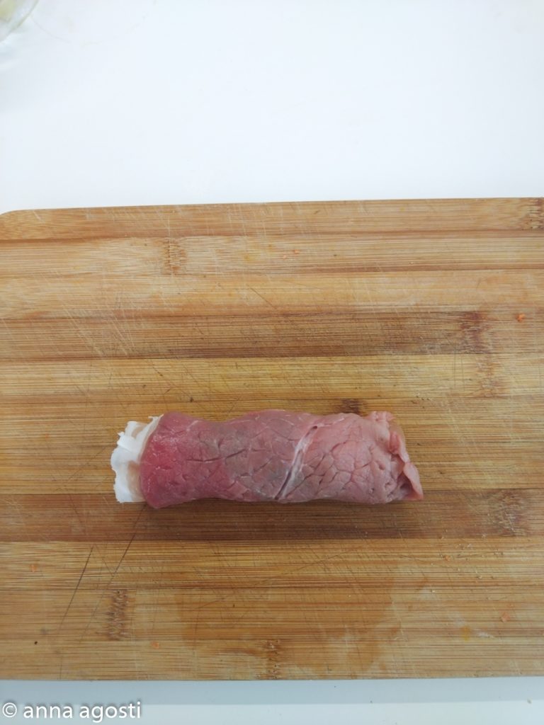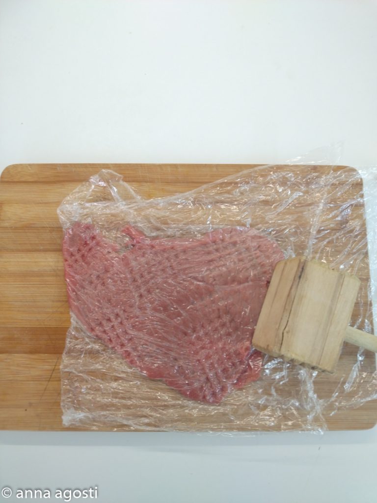 Para preparar os involtini à romana passo a passo, primeiro bata as fatias de carne para afiná-las.