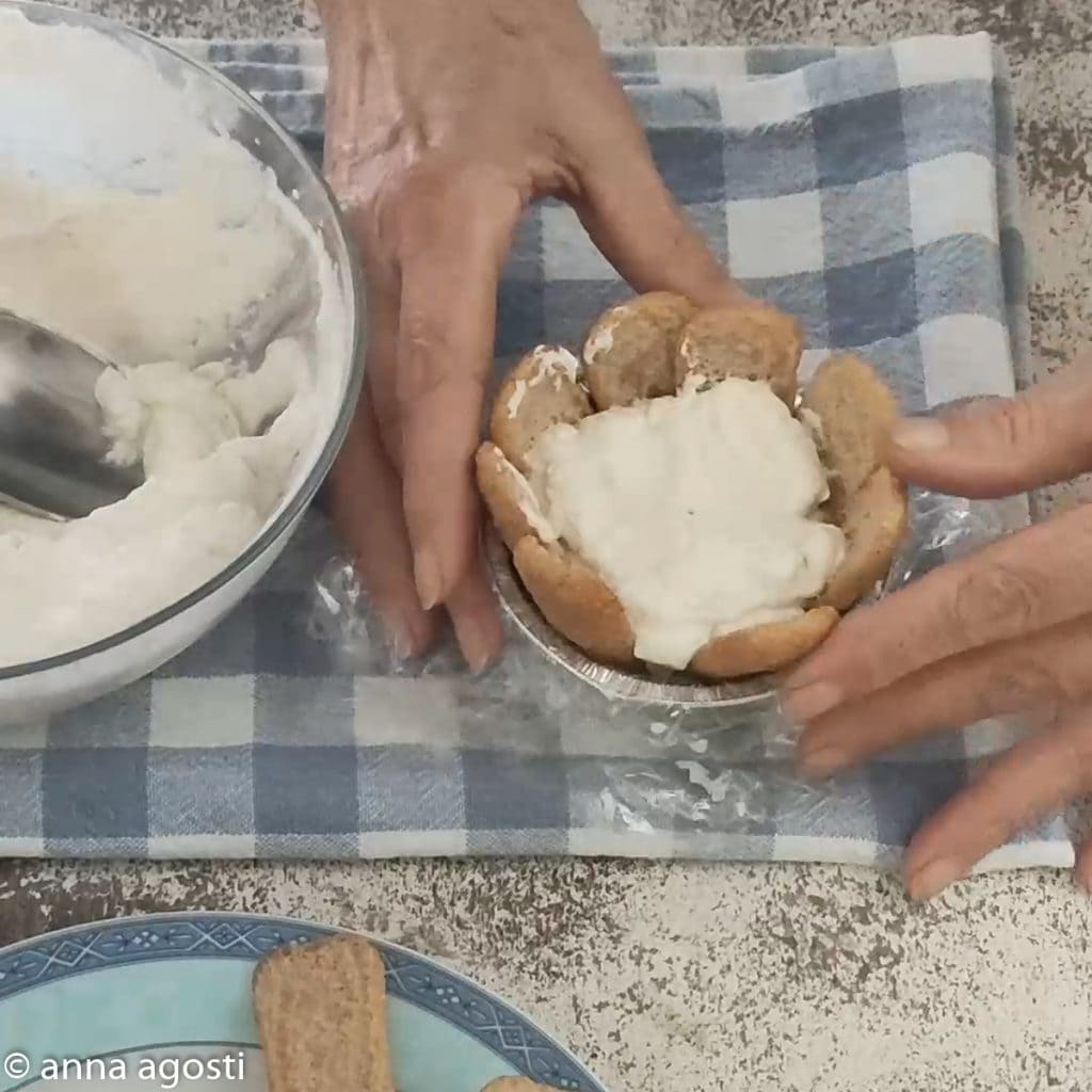 Preencha cada Tortinha de Pavesini com creme de café pressionando levemente para não deixar espaços vazios.
