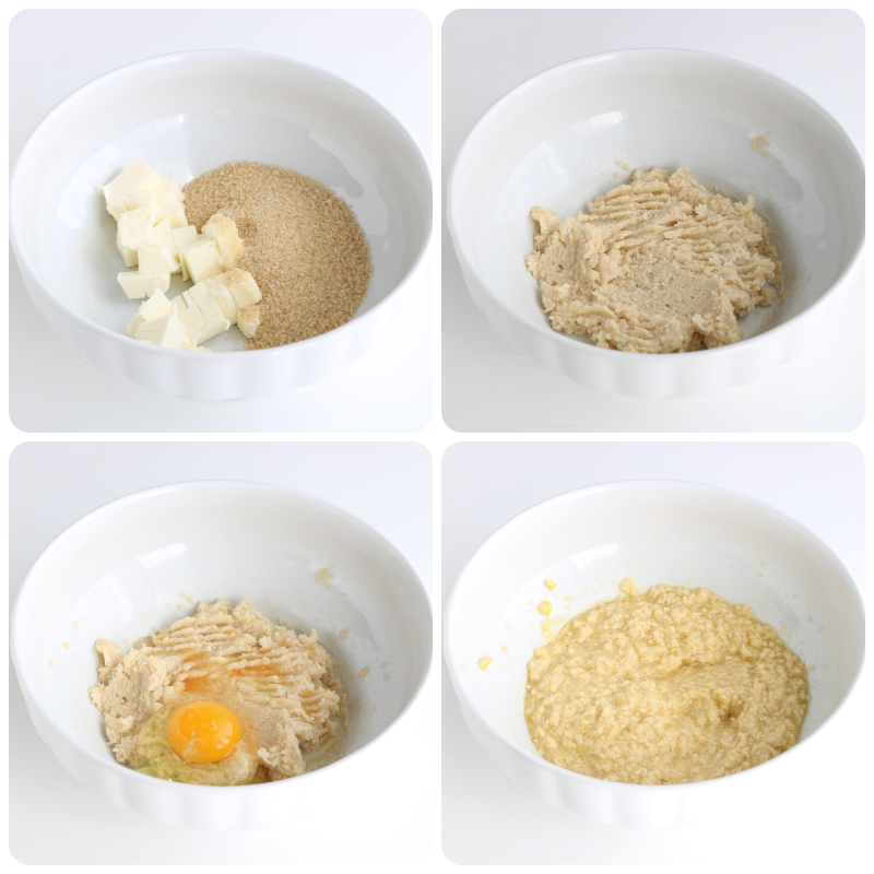 Trabalhe a manteiga e o açúcar com uma batedeira elétrica ou uma colher até obter um creme macio.