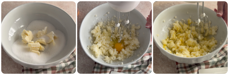 • Numa tigela, trabalhe a manteiga em temperatura ambiente com o açúcar, usando um batedor, até obter uma mistura macia e cremosa. Acrescente então o primeiro ovo e misture bem até ficar completamente incorporado.