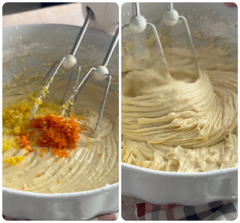 • Por fim, junte à massa as raspas raladas de um limão e de uma laranja não tratadas (com casca comestível) e continue a trabalhar o composto com a batedeira até distribuí-las de forma uniforme.