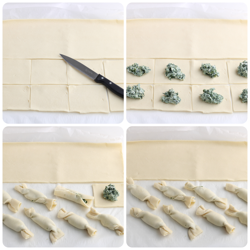 Para agilizar, você pode usar espinafre já cozido, congelado ou prepará-los em casa seguindo minhas dicas sobre como cozinhar o espinafre. O recheio de ricota e espinafre torna estes bombons de massa folhada macios e saborosos, assim como outros petiscos com massa folhada e ervas.