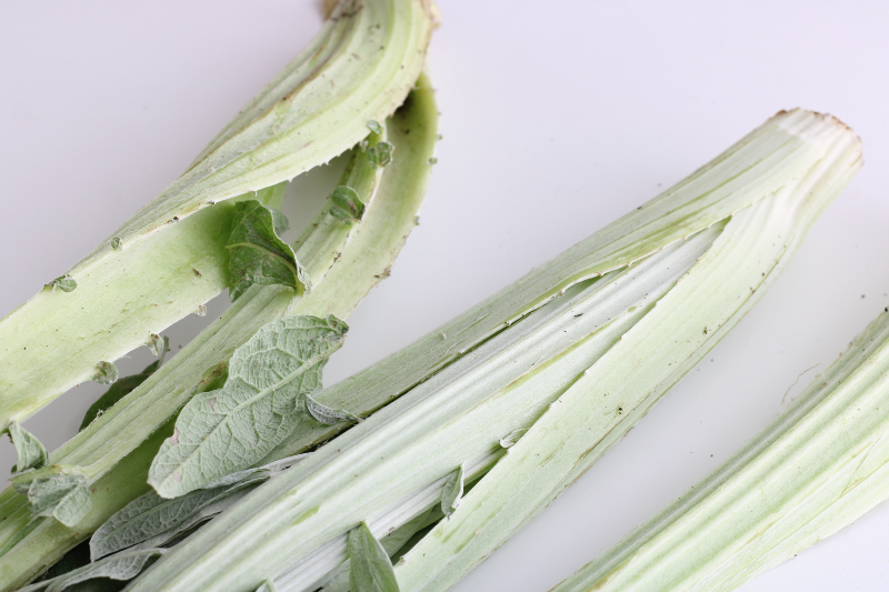Recomendo usar luvas descartáveis para não manchar as mãos e limpar os gobbis no momento em que for cozinhá-los, já que, assim como as alcachofras, eles escurecem facilmente.