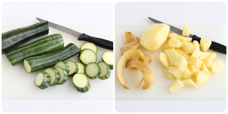 Lave as abobrinhas e corte-as em rodelas, depois descasque as batatas e corte-as em cubos.