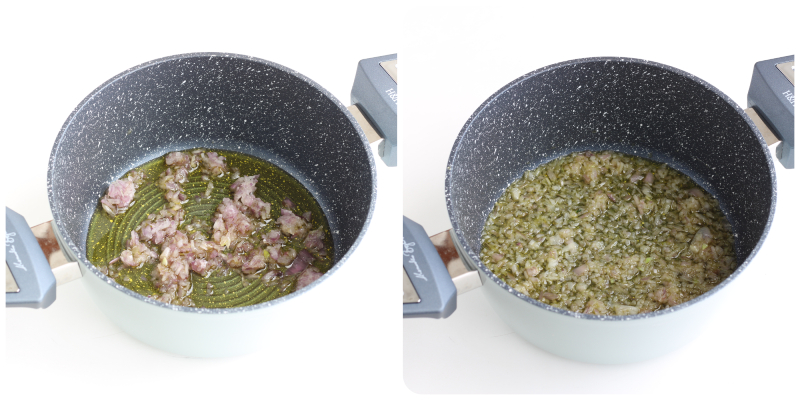 Em uma panela de bordas altas, aqueça o azeite e deixe os echalotes picados murcharem por alguns minutos.