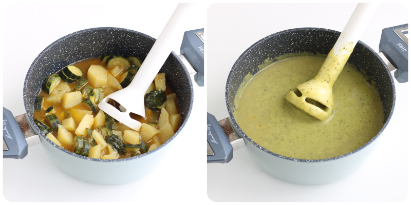 Assim que os vegetais estiverem cozidos, tire a panela do fogo e triture tudo com um triturador de mão até obter um creme homogêneo. Se ficar muito denso, adicione mais caldo.