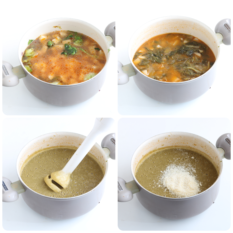 Despeje o caldo, ajuste o sal e a pimenta e cozinhe por cerca de 45 minutos. Verifique se as batatas estão cozidas, então passe os ingredientes com um liquidificador de imersão até obter um creme liso e aveludado.