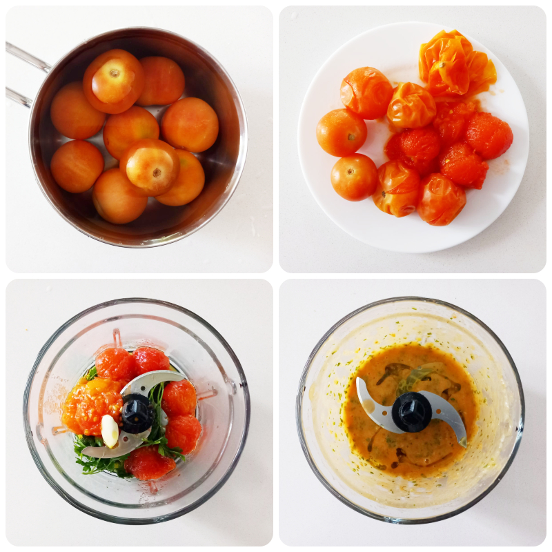 Em um mixer, coloque os tomatinhos descascados, a salsinha lavada, o dente de alho sem casca, o sal e a pimenta. Ligue o mixer e bata tudo, adicione aos poucos o azeite de oliva extra virgem até obter um molho com consistência adequada.