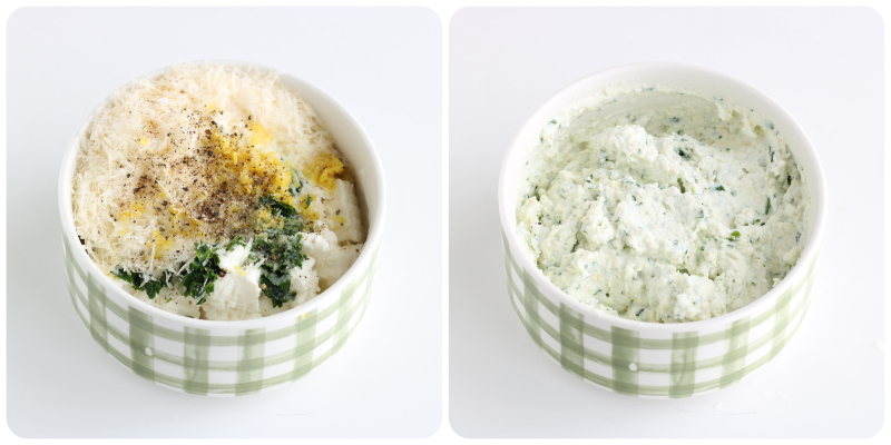 Em uma tigelinha, coloque a ricota, o queijo parmesão ralado, a salsinha picada, as raspas e o suco de um limão, o alho amassado com o espremedor de alho (se usar), o sal e a pimenta.