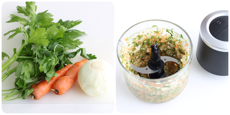 Prepare o misto para refogado com os aromas (cenoura, cebola e aipo) e deixe murchar na panela com meio copo de azeite e um dente de alho sem casca.