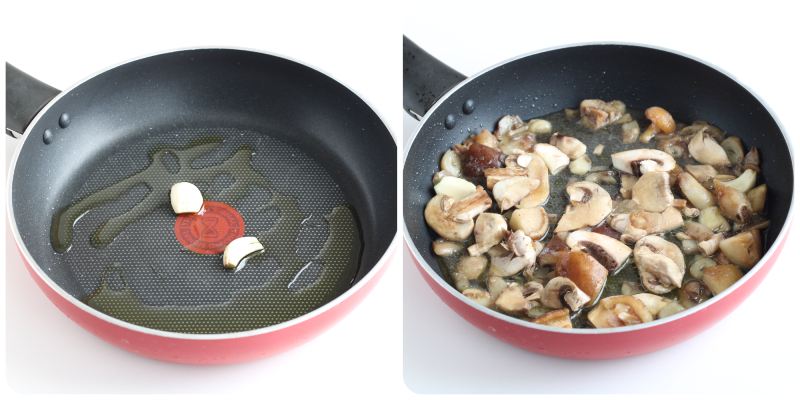 Em uma frigideira grande, refogue dois dentes de alho com um fio de azeite extravirgem. Adicione os cogumelos: podem ser porcini ou mistos, frescos ou congelados (eu usei os últimos). Salteie em fogo alto por alguns minutos até que percam a água e comecem a dourar. Cozinhe em fogo médio-alto, sem tampa, para evaporar toda a água que liberam. No total, o cozimento leva cerca de 10-15 minutos. Ajuste o sal e a pimenta.