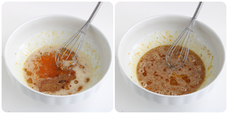 Adicione as raspas raladas de uma laranja comestível, a canela, o gengibre e o extrato de baunilha. Misture novamente para incorporar bem os ingredientes.