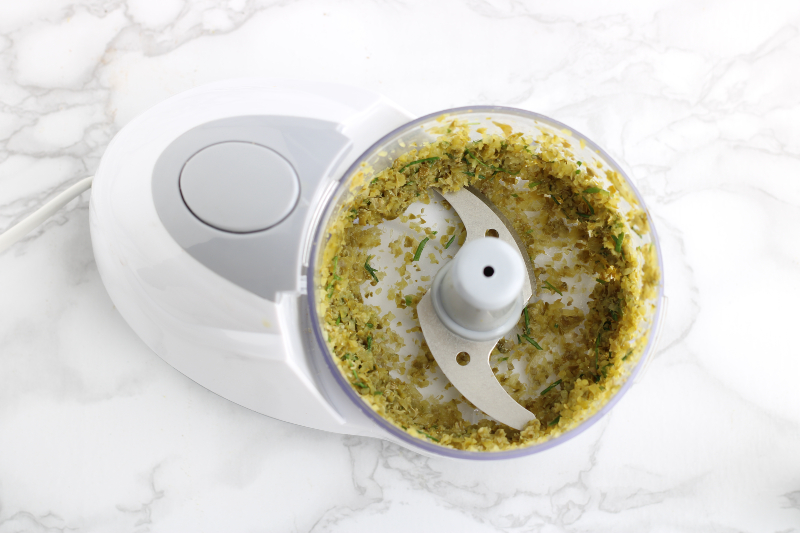 • Em um mixer, coloque os picles, as alcaparras e alguns talos de cebolinha,