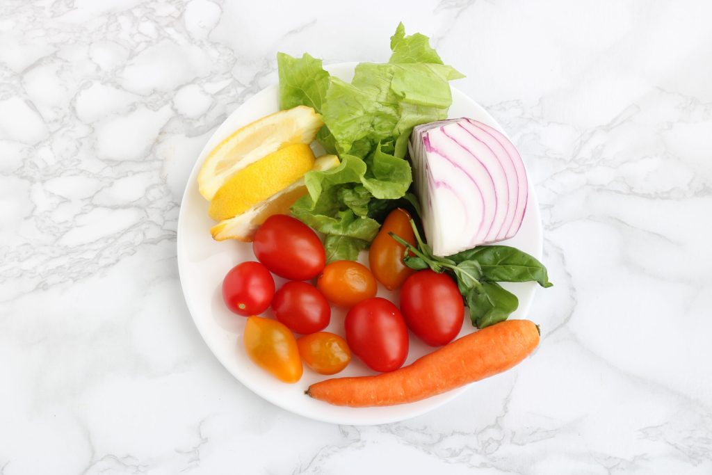 Proceda para lavar e limpar todos os legumes, tomates, cebola, cenoura, salada e prepare também o limão que será usado para o tempero.