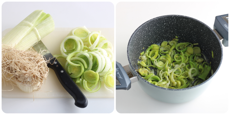 • Agora cuide do alho-poró: corte as raízes e a ponta verde escura, mantendo apenas a parte branca e verde clara; retire as duas ou três folhas externas mais duras e, em seguida, corte o alho-poró transversalmente para obter rodelas da espessura desejada.
