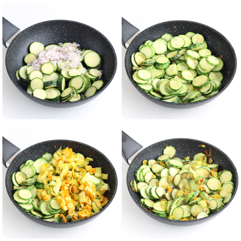 Pique a cebola finamente (eu usei o triturador manual), coloque-a em uma frigideira com o óleo, doure e adicione as abobrinhas. Refogue por cerca de 10 minutos até que fiquem macias. Adicione agora as flores de abobrinha, cozinhe por mais um minuto, sal, pimenta e desligue o fogão.