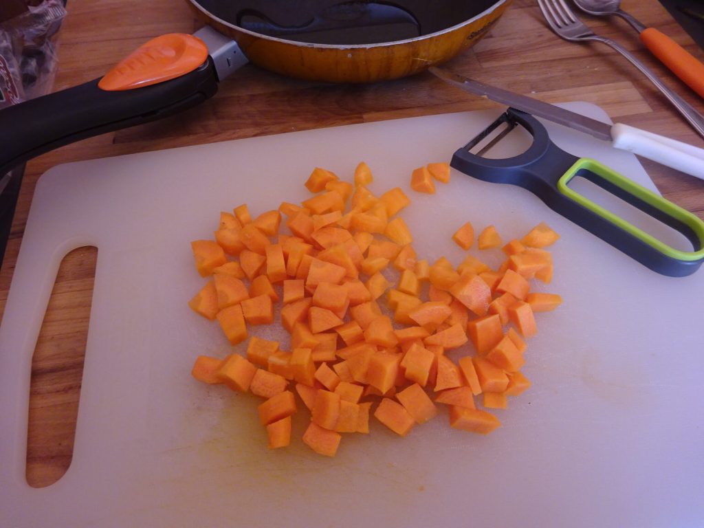 Enquanto isso, limpe uma cenoura e depois corte em cubos.