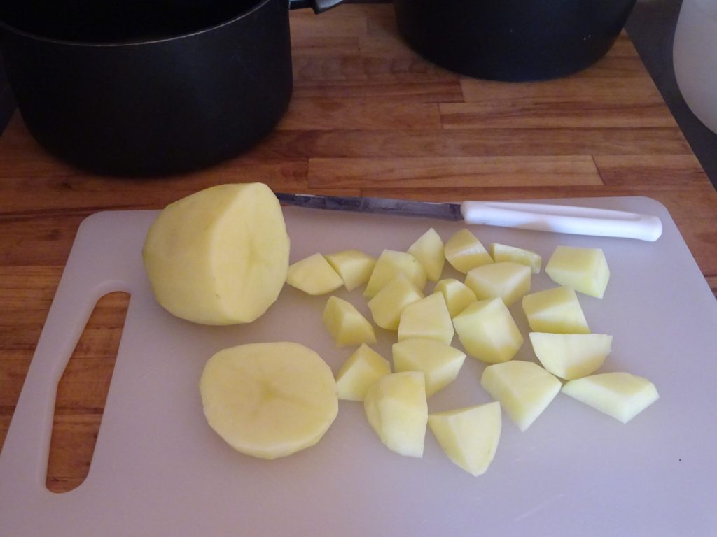 Descasque as batatas e corte-as em pedaços não muito grandes, assim cozinharão mais rápido.