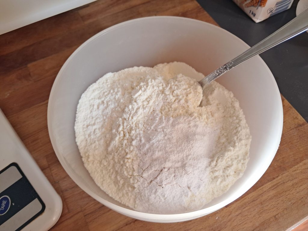 Em uma tigela, misture a farinha de trigo tipo 00 e o fermento para bolos.