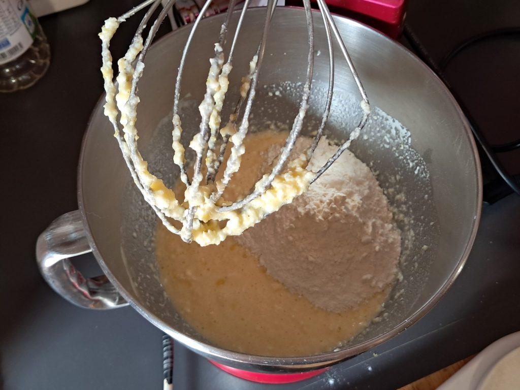 Pare a batedeira e adicione a manteiga (em temperatura ambiente) em pedaços e misture até que esteja tudo bem incorporado.