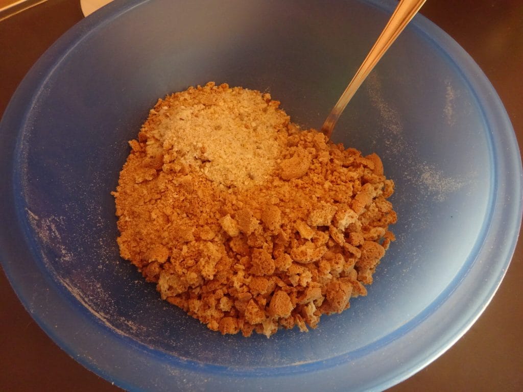 • Em uma tigela, bata os ovos com um garfo e depois adicione o açúcar mascavo, a farinha de rosca e, por fim, os amaretti amassados grosseiramente com as mãos. Misture até incorporar bem aos ovos.