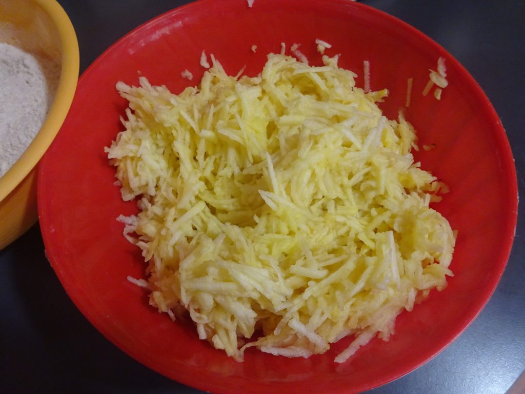• Em outra tigela, rale as maçãs, previamente descascadas, com um ralador de furos largos. Depois, divida-as em 3 partes.