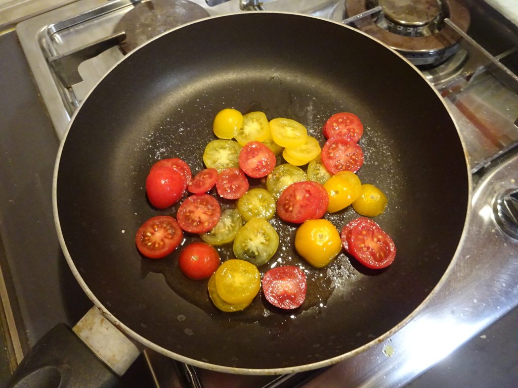 Neste ponto, retire do fogo e adicione a outra metade dos tomatinhos. Misture para saborizar tudo e deixe esfriar.