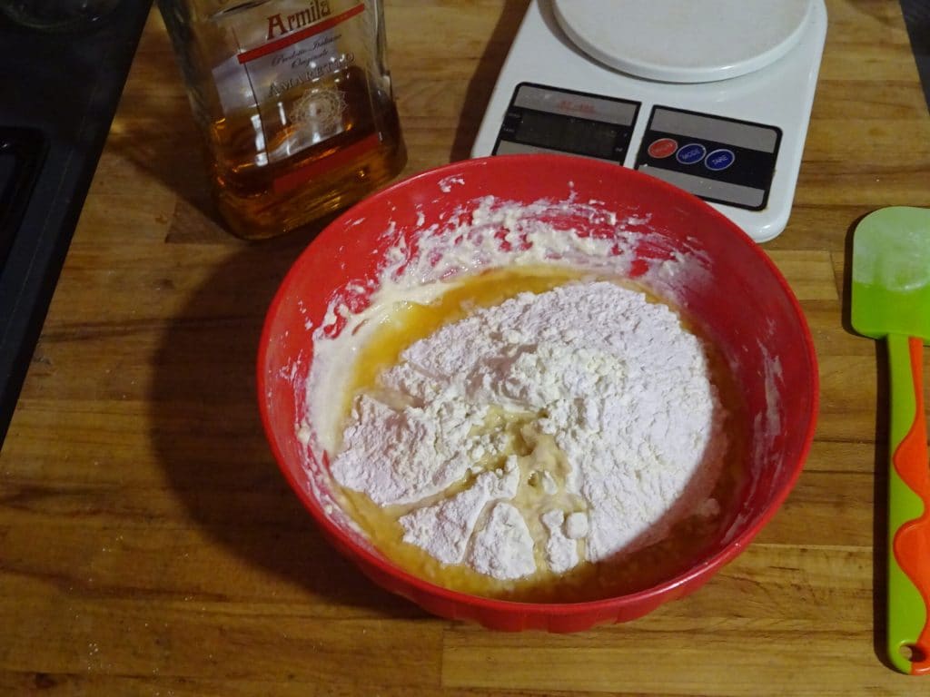 Em seguida, adicione a farinha 00, o fermento peneirado e o licor de amaretto. Misture com uma espátula até incorporar tudo.
