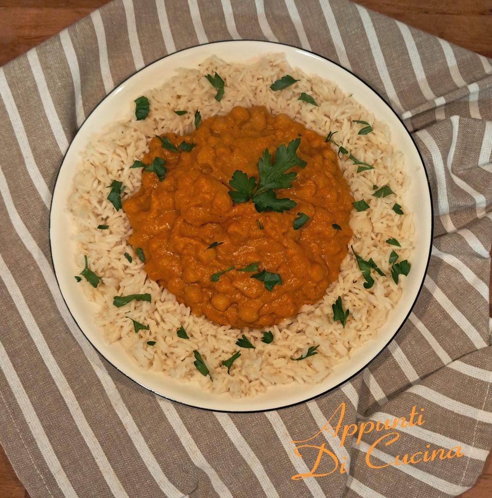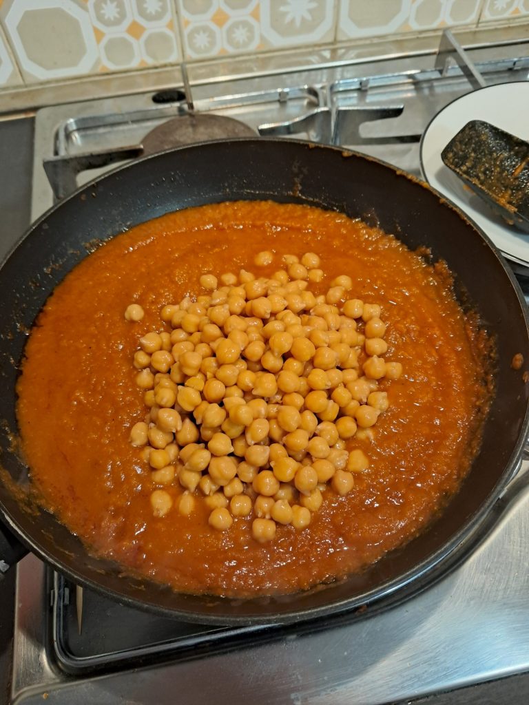 Coloque então a panela de volta no fogo, adicione o grão-de-bico cozido e o leite de coco, misture bem e deixe cozinhar por mais 5/10 minutos em fogo médio-alto e sem tampa.