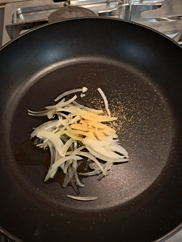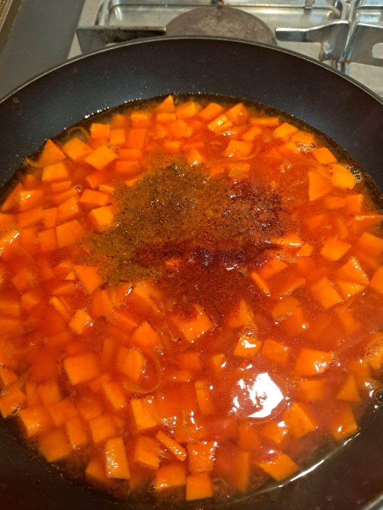 Adicione-a então à cebola junto com 1 colher de chá de curry, 1 colher de chá de páprica doce, 1/2 colher de chá de noz-moscada em pó e 250 ml de caldo de legumes. Cubra e cozinhe sempre com a tampa e em fogo baixo por 30 minutos.