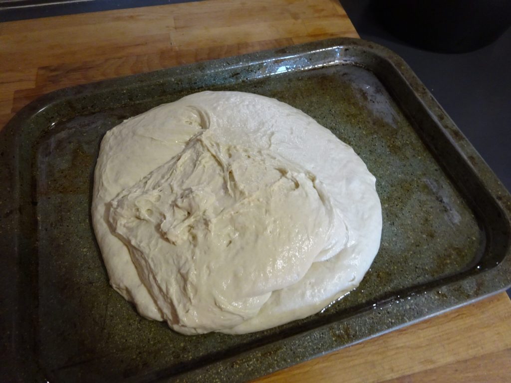 • Depois de 2 horas de fermentação, unte uma assadeira 20×30 e coloque a massa dentro.