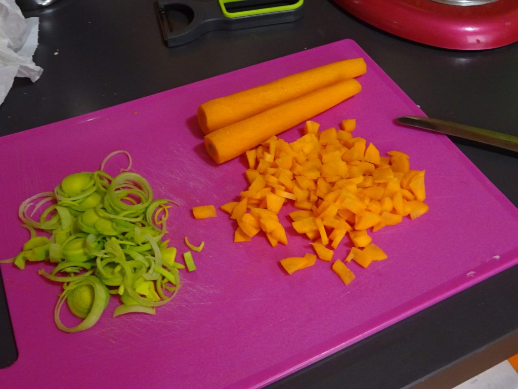 Enquanto isso, corte o alho-poró em rodelas finas e as cenouras em cubos de não mais de 1 cm.