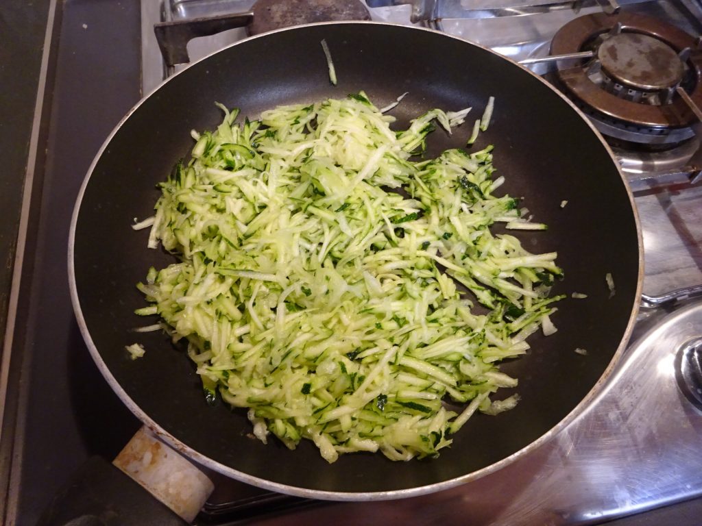 Enquanto os legumes cozinham, rale as abobrinhas com um ralador de furos grandes e depois aperte-as um pouco para retirar o excesso de água.