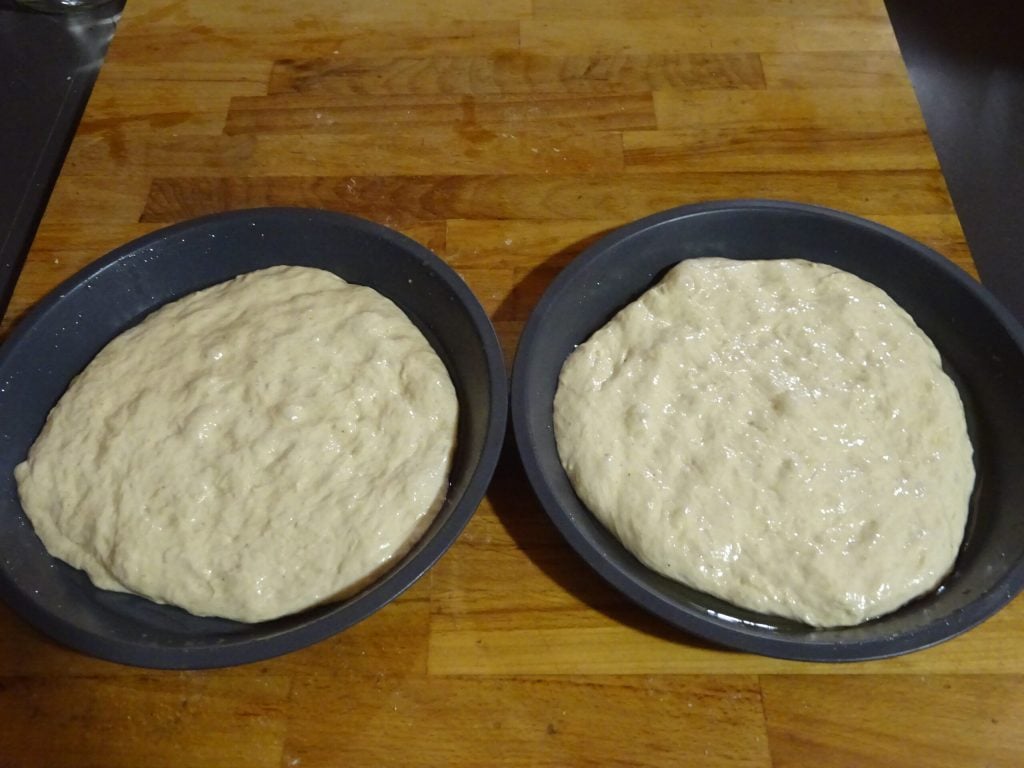 • Após as duas horas de fermentação, divida a massa em 2 partes iguais e espalhe-a em formas ligeiramente untadas.