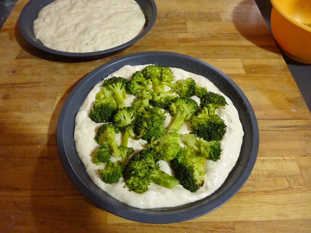 • Após a hora de fermentação, espalhe os brócolis sobre as focaccias. Cubra novamente com filme plástico e deixe crescer por mais uma hora.