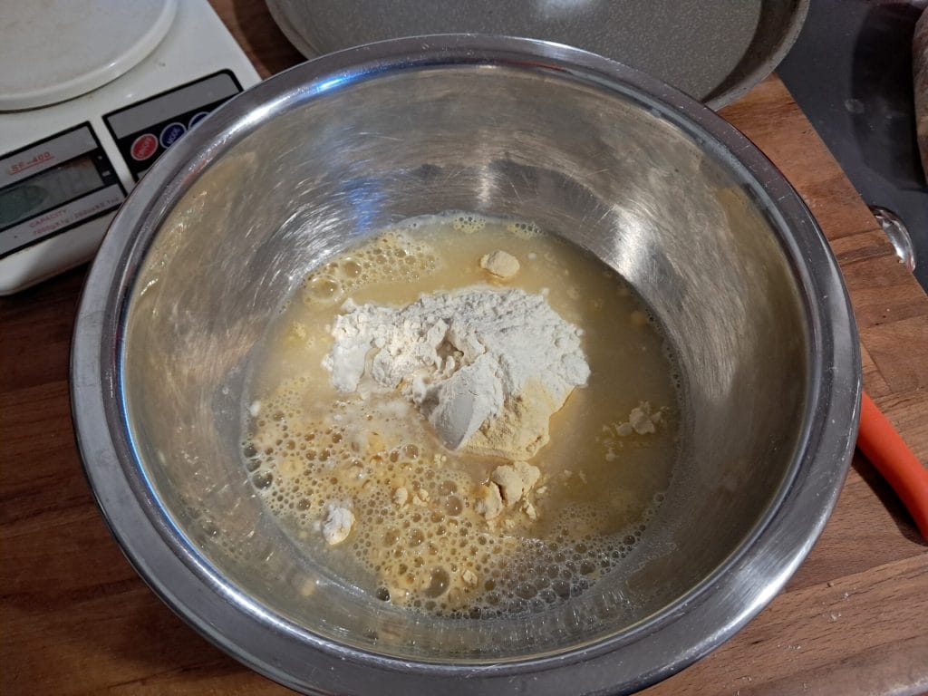 Adicione aos poucos a água em temperatura ambiente e mexa até que a água e as duas farinhas formem uma massa lisa e homogênea.