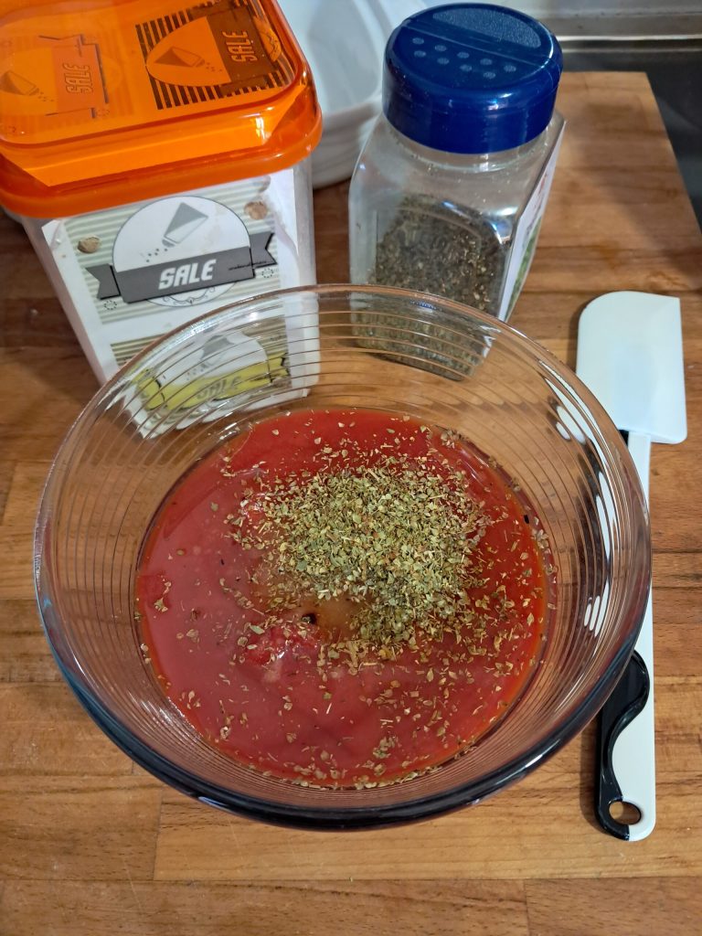 • Despeje o molho de tomate em uma tigela, adicione meia colher de chá de açúcar, 2 pitadas de sal, alho em pó, orégano seco e azeite de oliva. Misture bem para incorporar tudo e deixe descansar para pegar sabor.