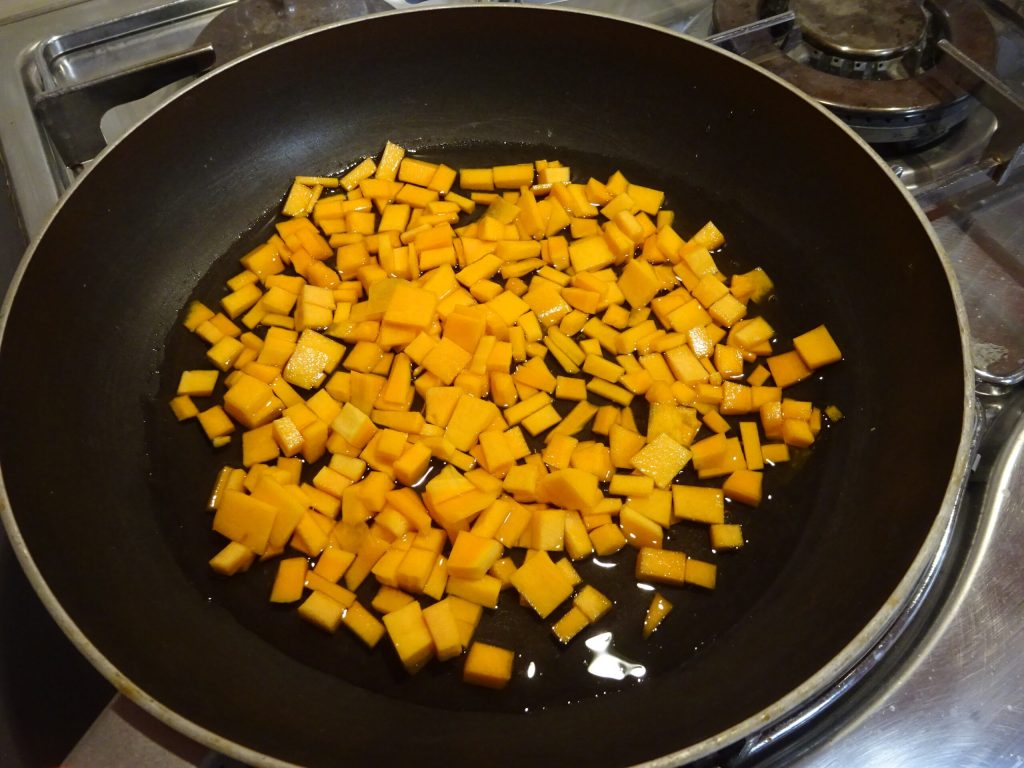 Corte a abóbora em pequenos cubos, cerca de meio centímetro, assim eles cozinham rapidamente.
