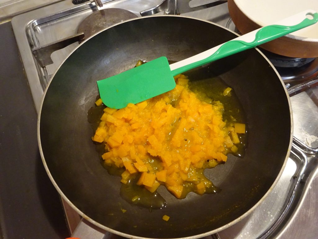 Uma vez que a abóbora esteja pronta, retire do fogo e amasse grosseiramente com uma espátula, para que algumas partes fiquem mais esmagadas do que outras.