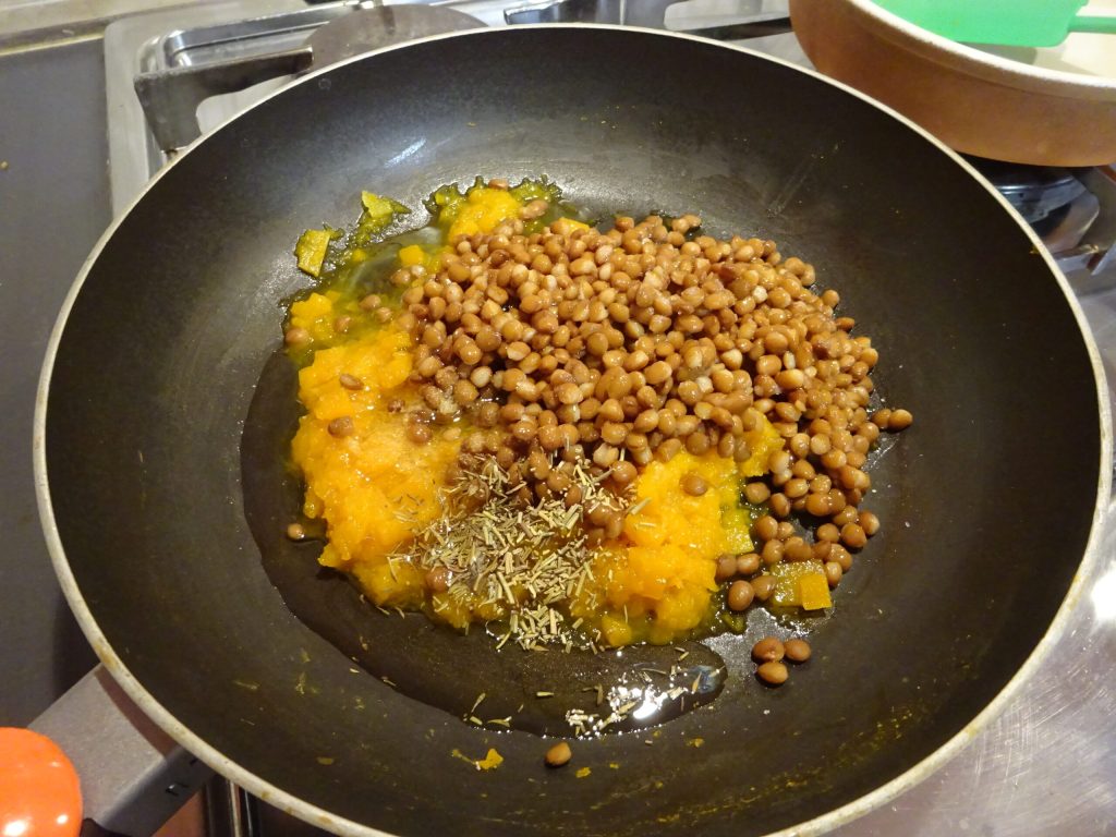Para começar, coloque a água para esquentar e cozinhar o macarrão; quando ferver, adicione sal e o macarrão. Retire o macarrão alguns minutos antes do final do cozimento, pois ele terminará de cozinhar junto com o molho de abóbora e lentilhas.