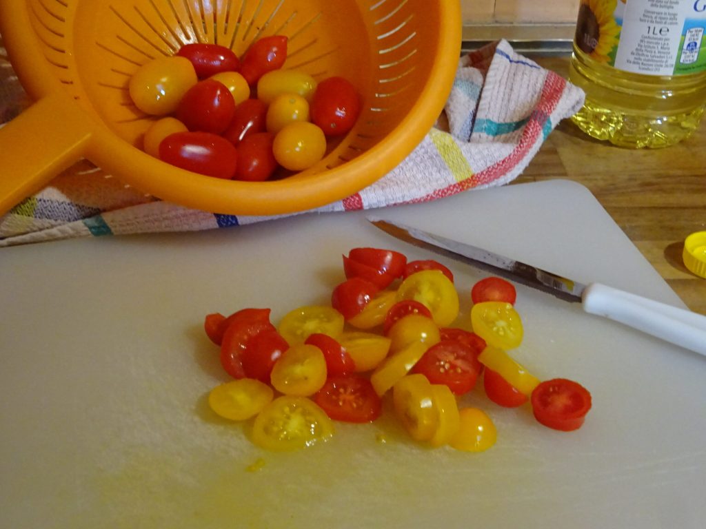 Agora lave 250 gramas de tomatinhos mistos amarelos e vermelhos, seque-os bem e corte-os em fatias de cerca de meio centímetro de espessura.