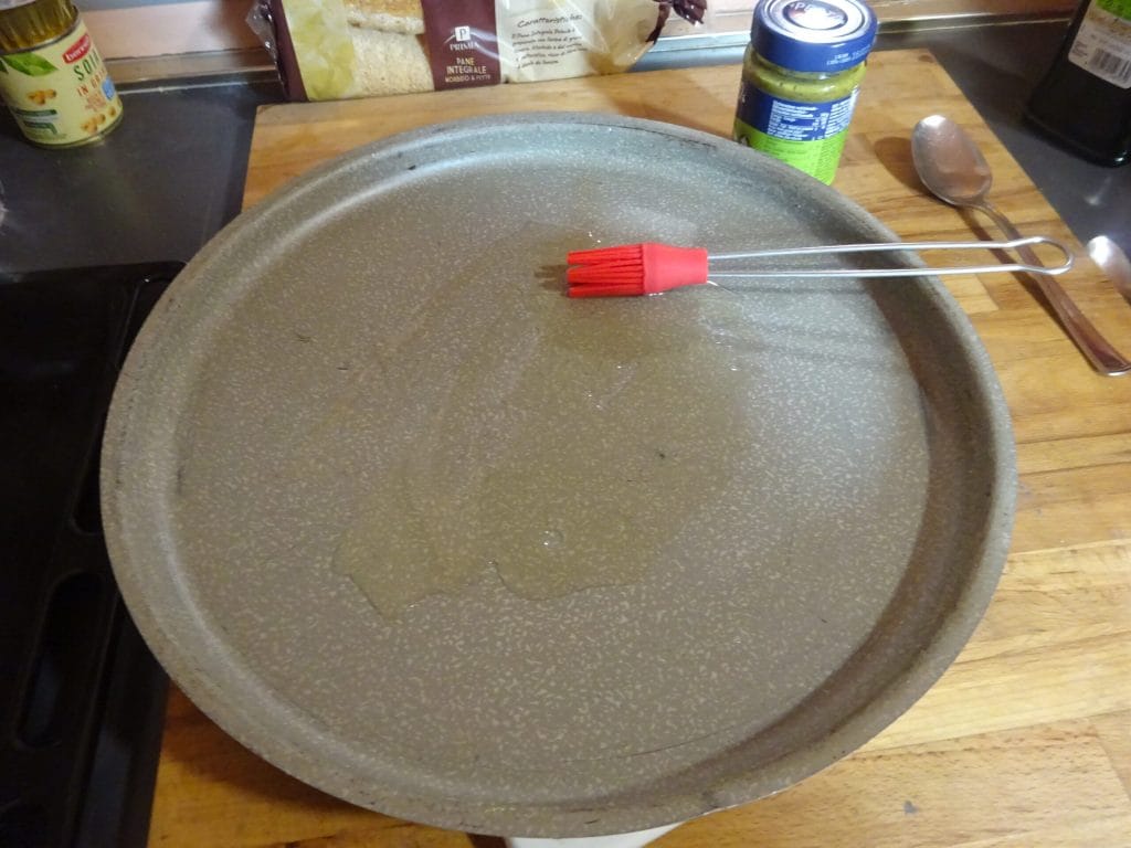 • Despeje 2 colheres de sopa de azeite de oliva em uma forma redonda para pizza e com a ajuda de um pincel, distribua-o por toda a superfície.