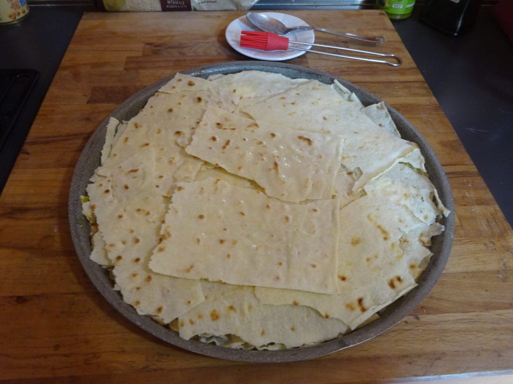 • Molhe as lâminas restantes de carasau e faça a camada de cobertura.