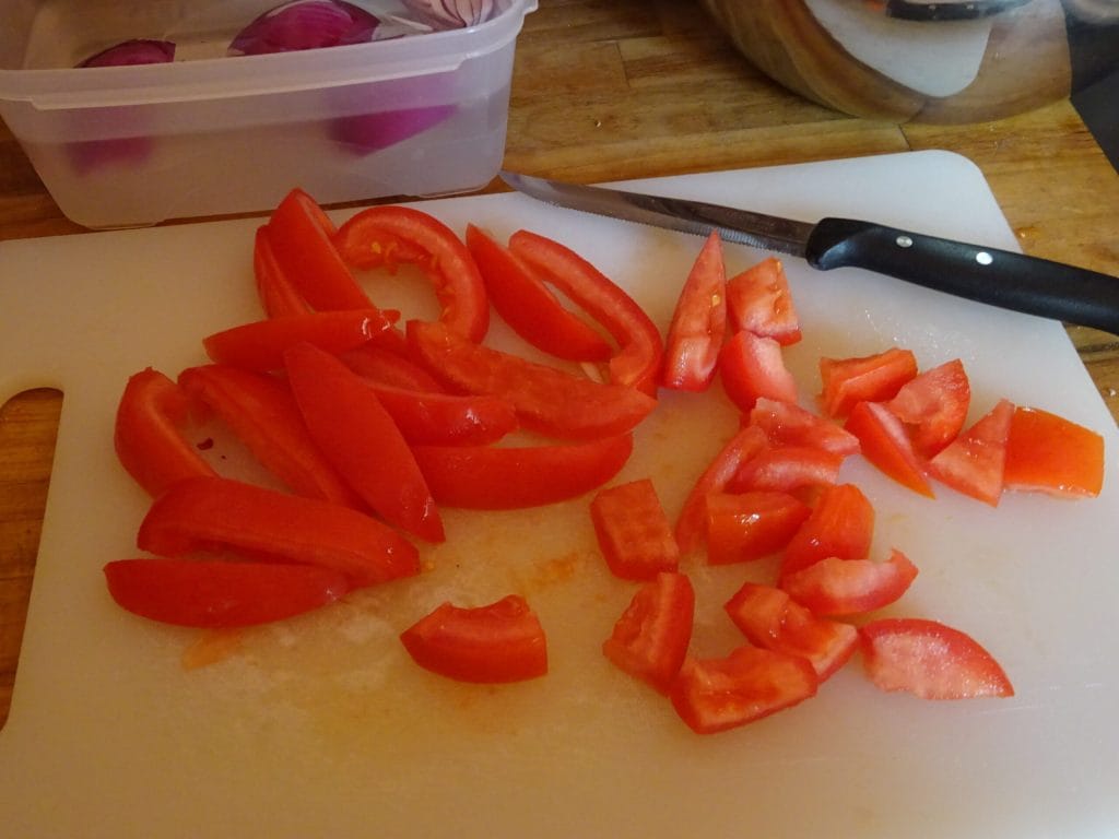 Lave os tomates, corte-os ao meio e retire as sementes.