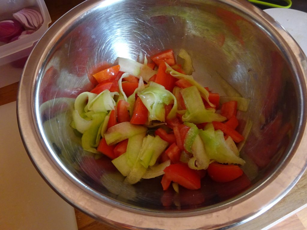 Agora escorra a cebola, seque-a com papel absorvente, corte-a finamente e adicione-a aos outros vegetais.